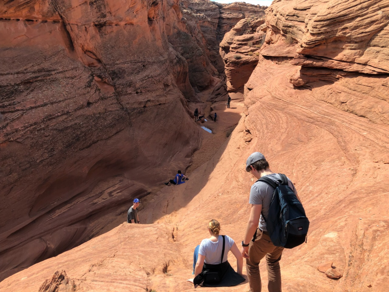 Rond Page zijn een aantal zogenoemde slot Canyons te bezoeken waaronder de beide Antelope Canyons maar gezien de enorme drukte hier zoeken wij een alternatief. We kopen een permit bij de Navajo Nation (alles hier is indiaans territorium) waarmee we langs de Highway mogen parkeren en te voet Waterholes Canyon in mogen. Dat laatste is nog wel een uitdaging want het pad is niet heel duidelijk aangegeven maar met wat kunst en vliegwerk en een best lastige afdaling komen we in de slot canyon. Wat volgt is een anderhalf uur durende aaneenschakeling van mooie rotsstructuren waardoor het zonlicht hier en daar heenkomt en waar we mooie foto’s en herinneringen maken. Heel tof om dit met zijn zessen te beleven. We vinden het laatste deel niet onder doen voor de Antelope Canyons en het grote voordeel hier is dat we misschien een tiental anderen zijn tegengekomen terwijl je in de commerciële Canyons met volksstammen tegelijk naar binnen gaat.