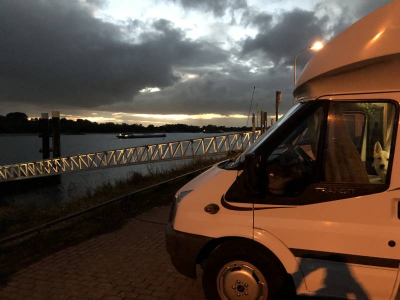 De NKC (nederlandse kampeerauto club) heeft hier samen met de gemeente een fraaie overnachtingsplek voor campers gecreeerd aan de Europakade. Een collectant komt ‘s avonds de “tol” ophalen en er is een muntautomaat waar je de stroomkabel op aan kunt sluiten. Moet je wel een lang draadje hebben, de onze redde het net. We staan pal aan de Rijn en gekukkig is het geen hoogwater! Tolkamer is ook nog een leuk dorp. Voor de camperplaats is een zogenaamde autosteiger waar het een komen en gaan is van binnenschepen die hier hun auto’s (en/of gezinsleden) aan dan wel van boord nemen. De rivier zelf is ook een brok van varende bedrijvigheid en vervelen doen we ons hier niet. Vanavond eten we nasi part II en ondertussen genieten van de zon die aan de duitse overzijde achter de wolken ondergaat.