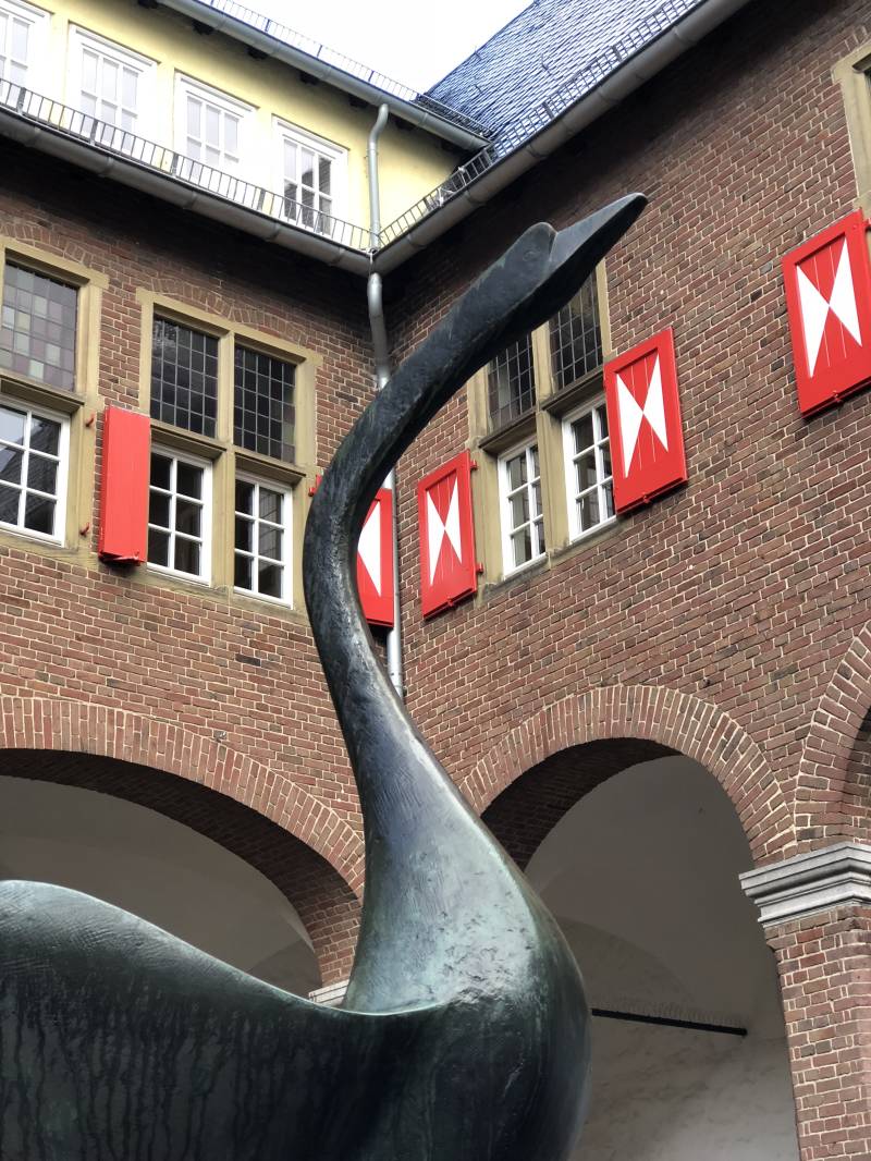 Na een onafgebroken nacht slaap van maarliefst negen uur is het prettig wakker worden! Eruit en Abby uitlaten in het Bergse Bos. Zo vroeg op de maandag is er natuurlijk nog niemand behalve een vroege eekhoorn. Terug bij Minnie Winnie maar weer een uitgebreid ontbijt met gekookt eitje, sapje en zo meer. Hier kunnen we wel aan wennen! Dan even douchen en bij de tweede koffieronde bepalen waar we vandaag heen rijden en wat we gaan doen of zien. We hadden afgesproken om dat van het weer te laten afhangen, maar dat lijkt voor heel Nederland en Belgie en de duitse grensstreek hetzelfde: opklaringen afgewisseld met af en toe felle buien. We kiezen Kleve net over de grens in Duitsland als eerste stop. Is maar een half uurtje rijden binnendoor. In Kleve kun je de camper makkelijk kwijt op een camperplaats bij het station en daarvandaan loop je een 700 meter tot in het centrum. Parkeren op die plek lost 5 euro en daarvoor kun je 24 uren staan, maar wij hebben daar andere plannen voor. Klevr blijkt een alleraardigste plaats met tal van mooie en leuke winkels waar we nog wat gemiste camper benodigdheden vinden en Wim zelfs een stukje nieuwe garderobe. Een letterlijk hoogtepunt, want op een heuvel boven het centrum gelegen, is de Zwanenburcht met Zwanentoren. Oorspronkelijke burcht uit rond 1100 en na de middeleeuwen tot de huidige bebouwing gekomen. De naam komt van een nederlandse sage; de zwanenridder (Lohengrin - Wagner heeft hier een opera over geschreven) die op zijn door een zwaan voortgetrokken bootje in Kleve aankwam (en nog in meer plaatsen die hetzelfde claimen😩). Niettemin een indrukwekkend bouwwerk. Inmiddels hebben we ook staan schuilen voor die bui die hier en daar voorkomt, nu hier dus.
