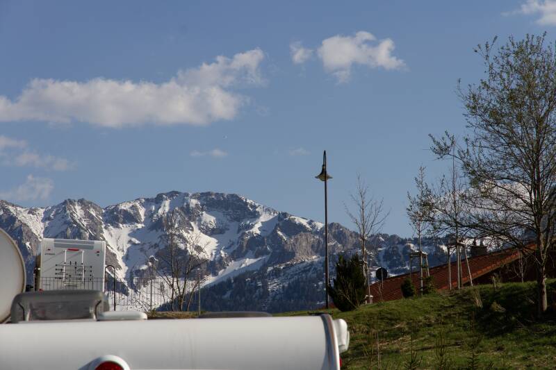 Vroeg wakker worden ook in Vlaardingen, rond vier uur.. douchen en Abby uitlaten. Eline ontwaakt ook en na de laatste ronden door het huis zitten we om kwart voor zes startklaar in de bus. We volgen een alternatieve route, ingegeven door Google Maps; via de A15 richting Nijmegen en van daar naar Venlo en dan Duitsland in. Daar volgen we de A61 langs Koblenz richting Speyer. De route via Karlsruhe naar Stuttgart wordt afgeraden en we kiezen via Heilbronn, achteraf een goeie keuze want weinig vertraging. Het meeste oponthoud komt pas tussen Heilbronn en Stuttgart en later ook bij en na Stuttgart richting Ulm. Maar het kan altijd rotter want de andere kant op staan mega-veel files. Ergens halverwege valt de TomTom helaas uit, oververhit zegt ‘ie.. Vindt geen satellieten meer en dan houdt de bruikbaarheid van het apparaat eigenlijk al op. Vanavond maar eens kijken. Voor nu verder op Google Maps, leve de mobiele telefoon! Uiteindelijk komen we voorbij Ulm en dan is het nog een goed uur richting de Oostenrijkse grens, die ik voor vandaag voor zover mogelijk als doel had gesteld. We verlaten de snelweg bij Nesselwang, waar ik een camperplaats heb gevonden. Helaas pindakaas, die is al vol. Een stukje verder bij Pfronten is er nog zo’n camperplaats. Niets meer dan een veredelde parking op grint waar nog zo’n 40 zielsverwanten staan. We kunnen er de bus verzorgen (water legen en innemen) en er is een alleraardigste Stube bij, waar ze vast een Schnitzel zullen hebben. We installeren ons en op onze vierkante postzegel kunnen we nog net de twee ligstoelen kwijt. Lekker in het zonnetje want het is heerlijk weer vandaag. De schnitzel hebben ze inderdaad en met een goed bier en een huisgebrouwd bier-likeur toe wordt het een gezellige boel. Na de maaltijd lopen we nog een klein stukje het dorp in maar veel eer te behalen valt er hier niet. De omgeving is wel mooi. Er ligt sneeuw op de toppen van de omringende bergen en de heldere lucht doet ons goed.