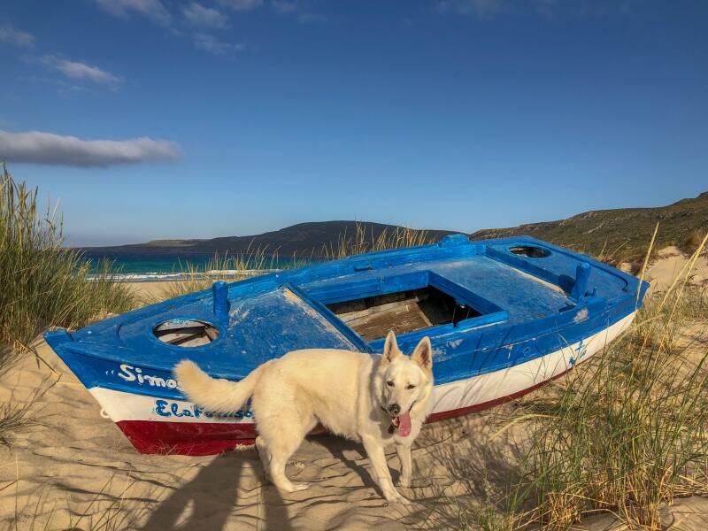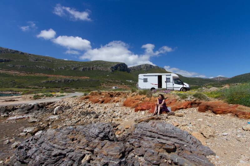 Heerlijk relaxed wakker geworden, uiteraard zonder wekker :) waarna een rondje met Abby over het kilometerslange strand, compleet verlaten en voor onszelf. Langzaam de ochtend rituelen volbracht en richting de haven gereden, waar we het pontje terug naar het “vasteland”, de Peloponnesos nemen. Er staat al een Duitse camper te wachten bij de pont, en na ons komt nog een Duitser aan die meteen al dik in de paniekstand is, en z’n camper pal naast ons zet, in plaats van netjes achteraan in de rij. Het bootje ligt er al, maar de bemanning doet netjes onderhoud en de pont is nog afgesloten met een touwtje. De Duitser is echt bang dat ‘ie niet meekan, want zodra de eerste voetgangers aan boord gaan start ‘ie de motor en probeert alvast de draai te maken om in z’n achteruit aan boord te gaan (je kan maar aan 1 kant de pont op en af). Dan wordt hij gesommeerd door een bemanningslid om te wachten wat ‘ie knarsetandend doet. Ondertussen een beetje ruzie maken met z’n ega, wat een gezelligerd... Enfin, uiteindelijk mogen ook de campers aan boord en puntje bij paaltje staat meneer ongeduld als eerste aan boord. De Duitser die al stond te wachten als laatste. Maar iedereen heeft een plekje. De overtocht is wederom kort en lekker schommelend, er staat best een pluk wind. Maar mooi dat water met zoveel kleuren blauw! Aan de overkant rijdt “ongeduld” nog een tijdje voor ons uit en neemt dezelfde mooie bergweg naar Monemvasia. Midden op een helling waar inhalen niet is toegestaan en eigenlijk ook niet mogelijk is, vindt ‘ie het uitzicht op Monemvasia zo mooi dat ie gewoon stopt, wat een ggrrrrmmmpppff..kl...zk/arsl..ch! Maar goed, die zijn we kwijt zodra we hem hebben ingehaald. Gelukkig geen tegemoetkomend verkeer. Verderop is een prachtige baai met een mooi klein wit kerkje en kerkhofje waar we stoppen voor koffie en het uitzicht. Super! Monemvasia rijden we nu voorbij en zetten koers naar Gytheion aan het begin van de tweede vinger, de Mani. Halverwege doen we een tussenstop bij een Lidl voor de nodige inkoop en dan maken we net voor Gytheion een stop bij een strand waar het wrak van de “Dimitrios” ligt. Al sinds 1981... Het wrak wordt er niet beter op, maar wel gaaf om te zien, en om te fotograferen! We rijden dan nog door Gytheion zelf, een leuk havenplaatsje met helaas geen goeie kans om te stoppen, naar een camping net voorbij het dorp. We installeren ons tussen de sinaasappel en mandarijnen bomen (plukken mag zoveel je wilt) en relaxen verder. Het is mooi weer maar wel met een behoorlijk harde wind, zodat buiten zitten aan het eind van de middag geen optie meer is. In de vroege avond lopen we langs het strand al zand vretend naar de taverne van Takis, die een ondefinieerbare wrap met varkensvlees en een heerlijke tadziki serveert, met een half litertje wijn, wat brood en een zoet toetje plus twee grappa’s voor 23 (..) euro. Zo gaan we nog eens lekker uit eten! Vanavond speelt Ajax en zijn we mega benieuwd naar wat het gaat worden, helaas is de WiFi hier zo slecht dat het blog uploaden niet eens lukt, dus hopen we er het beste van zonder het waarschijnlijk zelf mee te maken. Jammer!