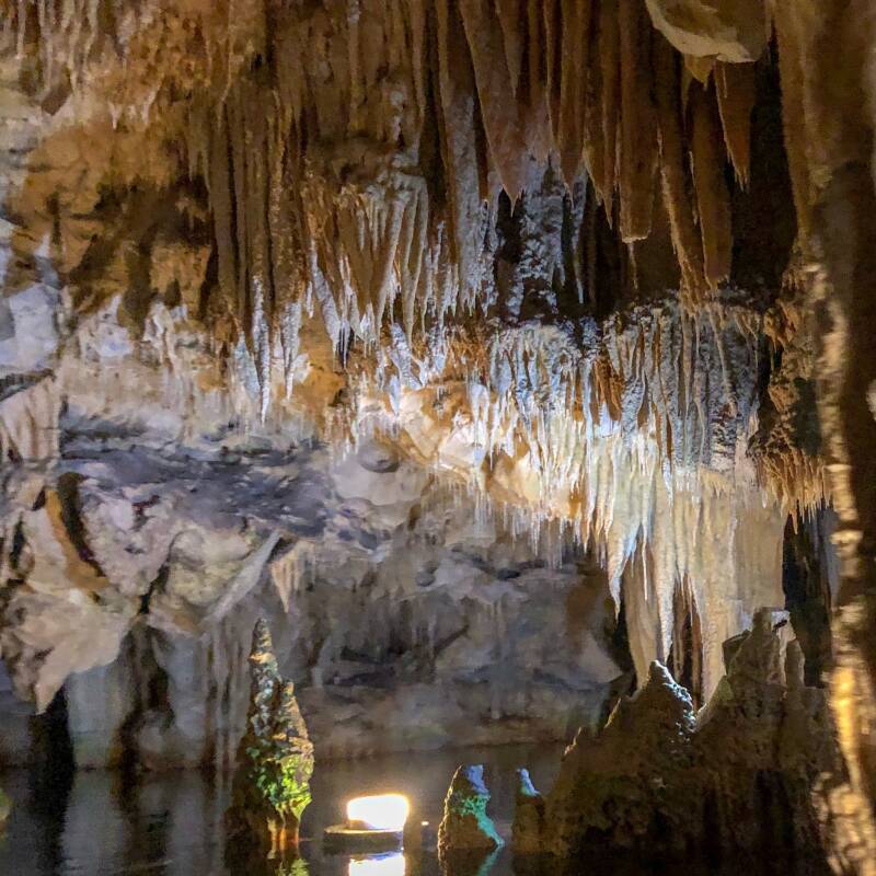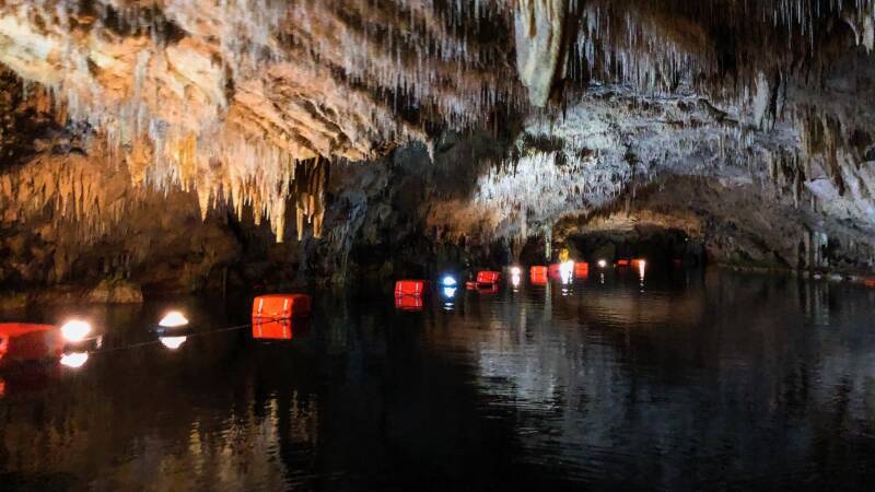 We melden ons dan als eerste aan het loket voor kaartjes, zijn een tikkie te vroeg want om negen uur is de openingstijd en het is pas 1 voor 9.. de Grieken houden (misschien wel gelukkig) een iets andere standaard van tijd aan dan wij gehaaste westerlingen. Er staan nog een handvol andere grotbezoekers, waaronder een stel Duitse camperplaats buren waarmee we in gesprek komen. Uiteindelijk gaat het loket open maar is er een probleem met de printer. Ook dat wordt met vereende krachten na een tiental minuten opgelost en gewapend met onze toegangskaarten begeven we ons naar de ingang van de grotten. We hebben het idee dat men eerst even wil wachten tot er voldoende volk verzameld is. Ons geduld wordt nog wat op de proef gesteld maar uiteindelijk; we mogen! Je gaat in bootjes met een groepje van vijf of zes de grotten in. Het is een schitterende tocht van een goed half uur langs enorme zalen vol stalagmieten en stalagtieten. Sprookjesachtig, en het neemt voor ons zeker een tweede plaats in na de Carlsbad Caverns in de VS. Het blijft altijd moeilijk vind ik om de binnensten van zo’n grot op de gevoelige plaat vast te leggen, maar hier een kleine poging: