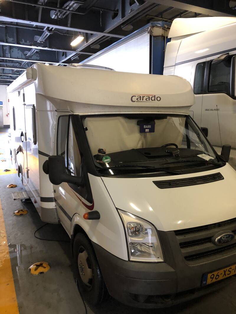 We worden vroeg wakker in de camper op de ferry. Ondanks de geluiden om ons heen en het monotone gedreun van de scheepsmotoren, hebben we toch goed geslapen. Op het dek achter ons zien we het regenen, dat belooft niet veel goeds. De italiaanse kust is met moeite te ontdekken. Om half tien liggen we vast aan de kade en om exact half elf zijn wij aan de beurt om van boord te rijden. De ferry was redelijk vol met vrachtwagens en die moesten er bijna allemaal eerst af. Buiten regent het inderdaad pijpenstelen. We maken een snelle stop om Abby haar behoefte te laten doen (dat vertikt ze op elke boot) en dan schieten we de autostrade op naar het noorden. De regen houdt op enig moment wel even op om daarna in alle hevigheid weer te beginnen. Hoosbuien zijn ons deel vandaag. We besluiten om maar te blijven rijden en te stoppen als we het zat zijn. We schuiven ergens bij Modena, na bij Bologna flink file te hebben gereden, een MacDo naar binnen (dit geheel tegen ons geloof maar als we vanavond ergens staan hebben we geen zin meer om te koken) en eindigen uiteindelijk bijna droog en na een machtig mooie zonsondergang boven de Alpen, op een camperplaats in Peschiera del Garda, aan het Gardameer dus: hebben we mooi bijna heel Italie doorkruist vandaag. Hiervandaan hopen we op droog weer om via een toeristische route de Alpen te doorkruisen.