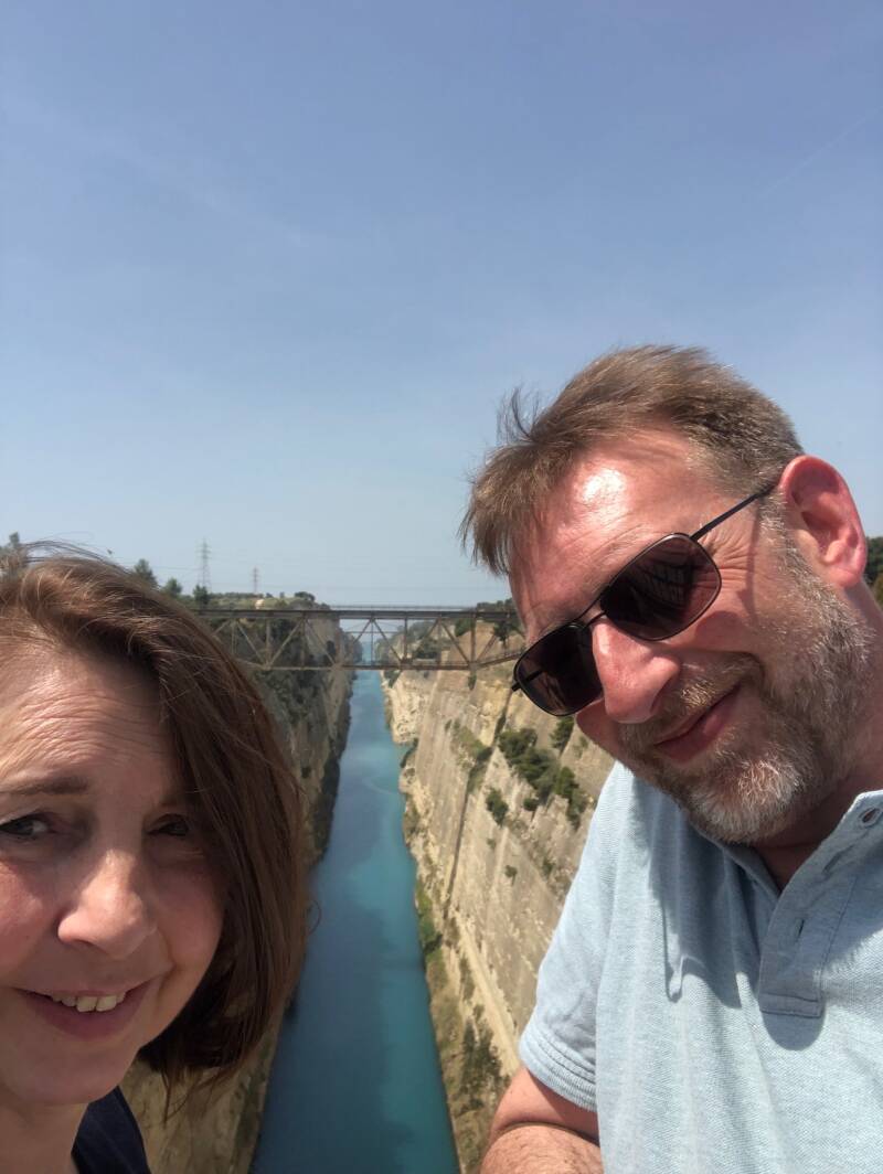 We komen terecht in file-leed van dit paasweekend (hier is dat een week later) en alle Atheners lijken op weg richting de Peloponnesos. Bij een tolpein zijn er denk ik een twintigtal poortjes en de auto’s staan er veertig rijen dik. Een beetje doordrukken en toeteren hoort er dan bij en ik pas me maar aan. We komen zonder schade door de tol en daarna wil het nog niet zo vlotten op de weg. We zien onder en langs ons een secundaire weg en besluiten af te slaan en die verder te nemen. Ik begrijp nu nog niet waarom verder niemand op dat idee kwam en zo komen we redelijk snel in Korinthos en ineens rijden we over een brug en zien we onder ons het Kanaal van Korinthos. Dat ken ik vanuit mijn Vertom-tijd, toen we er regelmatig met onze coasters doorheen voeren. We stoppen de bus aan de overkant en er blijkt een mega toerist-trap te zijn met winkeltjes waar ze je een zonnebrilletje voor twintig euro aan willen smeren, die je bij de Action voor minder dan drie eurie zal weten te scoren. Eline laat zich niet neppen en weet even later een nepperd van Rayben voor veul minder te scoren (zonnebril thuis laten liggen..). Het kanaal is indrukwekkend, diep en leeg.. Helaas geen schepen op dit moment.