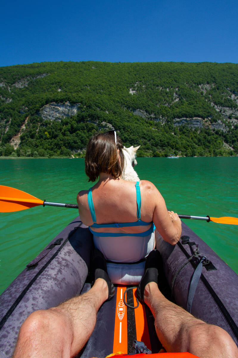 Geen verplaatsingen vandaag behalve naar de waterkant en terug, welgeteld 15 meter heen en weer. En dan uiteraard roeien. Heerlijk weer, buiten ontbijt, Frankrijk en de camping komt tot leven. Veel stelt dat hier niet voor en meer moet het ook zeker niet zijn. Vanochtend verkennen we de rechterhelft van het meer vanaf de camping. Instappen kunnen we “voor de deur” en als eerst passeren we het dorp hiernaast, St. Alban de Montbel waar een mooi kerkje op een heuveltje staat. Een eind verderop komen we het einde van dit deel van het meer tegen, naast een andere camping. Midden in het meer liggen twee eilandjes en die willen we wel bezoeken. Dichterbij gekomen blijkt een en ander afgeboeid te zijn, het ene eilandje is voor vissers en op het andere mag je niet afmeren want dat is beschermd gebied. We kunnen wel even afmeren langs de meerpaaltjes die her en der staan en we dobberen zo af en toe lekker op het gemak. Terug op de camping blijkt dat we toch al bijna twee uur aan het varen zijn. We doen de lunch bij de camper en relaxen nog wat voor de tweede sessie vanmiddag, uiteraard de andere kant van het meer verkennen. Vissen zien we nog erg weinig alhoewel er best wat roeibootjes met vislijnen her en der liggen. We passeren prachtige huizen met boothuisjes erbij en enorme tuinen aan het water, 1 zelfs met privé tennisbanen. Voorbij een openbaar strand en bootjesverhuur komen we aan het andere ‘einde’ van het meer en we besluiten aan de overkant langs de bergrug terug te varen. Hier lopen de rotsen door in het water en zien we eindelijk legio visjes. Bijna allemaal hetzelfde kleine spul. Het barst ervan. Weer hebben we her en der aanspraak doordat Abby een prominente plek in de kajak heeft, leuk is dat. Uiteindelijk dobberen we nog wat en maken wat slagen terug naar de camper. Al met al varen we een goeie vier uur. Het is perfect weer om de boot lekker te drogen en we relaxen de verdere dag. Morgen gaan we verder richting de Jura.