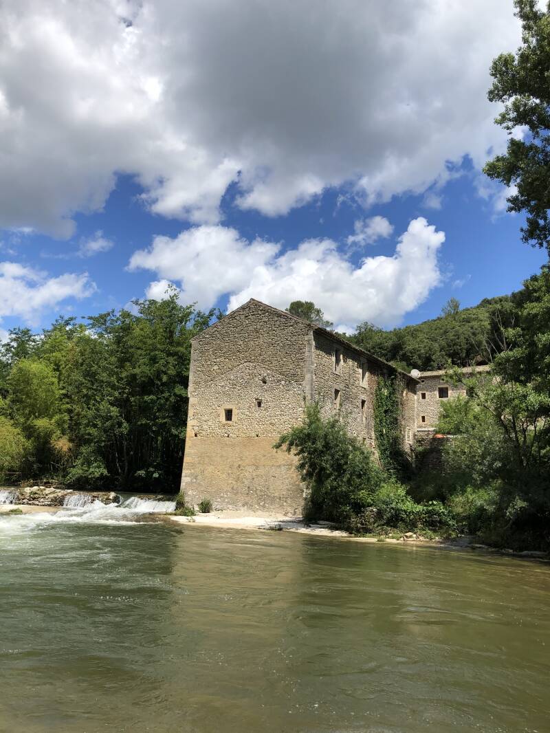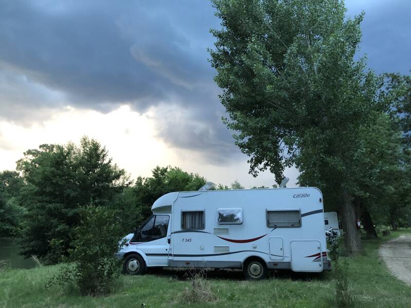 Hadden we gisteravond toch nog een fikse onweersbui boven onze camping. Vanochtend was alles weer pico bello en mooie blauwe luchten met hier en daar wat stapelwolken. Een perfecte dag om niets anders te doen dan een beetje relaxen en rond de camper lummelen. En om nog een keer te gaan kajakken natuurlijk. Dit keer zonder natte broek aan boord gekomen en aangekomen bij de stroomversnelling proberen we het nog een keer, helaas, we komen er niet doorheen. Net naast de stroomversnelling is een stukje met dicht riet en stilstaand water. Daar pakken we de boot op en lopen tot na de versnelling en gaan daar weer te water. We passeren een mooie boogbrug en een eind verder landen we op een eilandje, dat we voor onszelf hebben. Daarachter wederom een waterval, dus heel erg ver komen we niet. Mooi is het wel, en we kunnen het peddelen lekker oefenen! De terugtocht gaat lekker, nu door de versnelling en dat lukt ons ook zonder om te slaan. Vanmiddag doen we letterlijk niks, we lezen en suffen wat voor ons uit tot aan het avondeten. Dat doen we op het terras van het camping restaurant waar ze prima salades en een uitstekende entrecote serveren. De campingeigenaar vertelt dat hij hoopt slechts 50 procent omzetverlies te hebben, maar dat zou op kunnen lopen tot 65 procent. Deze camping is ook pas in april open en gaat eind oktober weer dicht, voordat het water in de Ceze te hoog komt en de camping-plekken elk jaar overstromen. Vier weken per jaar zijn we bezig om alles op- en af te bouwen. Een groot deel van de dag waren we de enige gasten. Gelukkig voor hem komt er nog een camper en een tentkampeerder voor de nacht, en is het terras redelijk bezet met lokalo’s. Een heerlijke relaxte dag, en de kajak is een goed besteedde aankoop. Nu al plezier van!