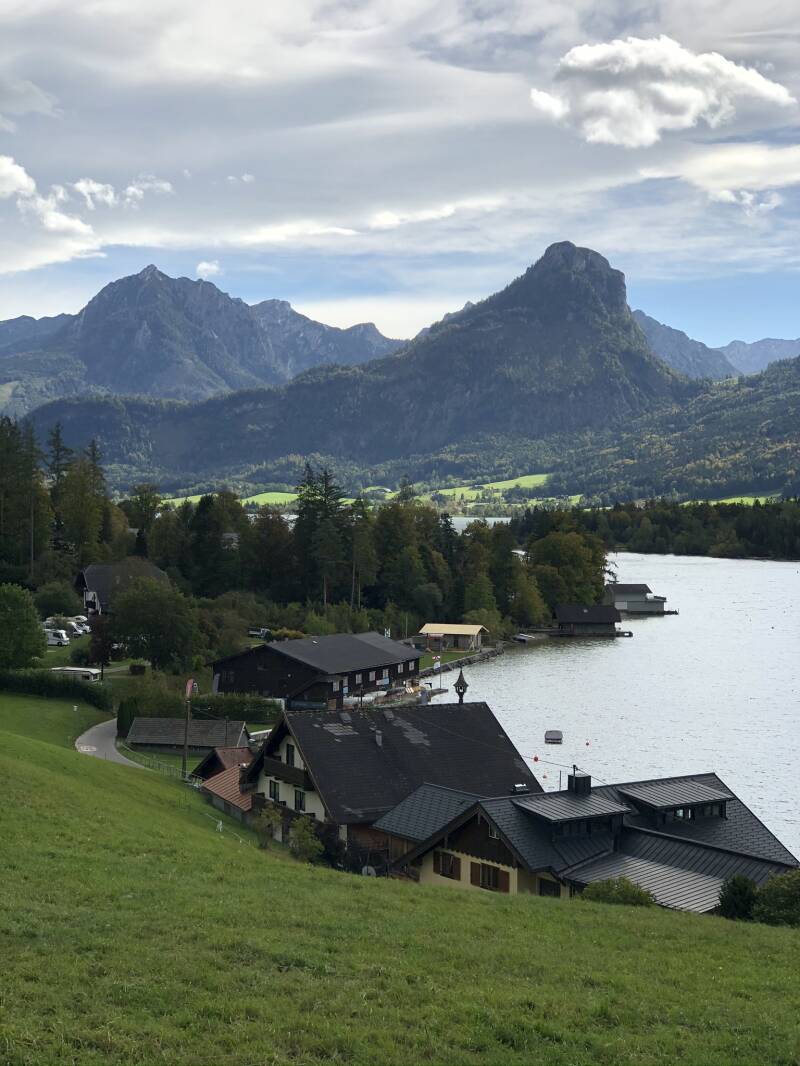 We worden laat wakker, en dat ondanks de föhn die gisteravond is opgestoken en die stevig doorwaait. De lucht aan de overkant van het meer is flink opgeklaard, dat ziet er goed uit voor vandaag. Net na tienen kiezen we het hazenpad verder door de provincie Salzburg. Langs de rivier de Salzach bereiken we de omgeving van de stad Salzburg en bij Hallein slaan we de snelweg af en rijden binnendoor naar het Salzkammergut, een verzameling van meren ten oosten van Salzburg. Een prachtige omgeving met mooie meren en meertjes. De bergen zijn hier iets minder hoog en ook wat minder ruig. De föhn blaast onverdroten voort en het is droog met een graad of 25. We hebben een camping in het gehucht Ried op het oog, aan de noordkant van de Wolfgangsee. Op loopafstand ligt St. Wolfgang im Salzkammergut, waar je met de boot over het meer kunt en met een tandradtrein de bergen in. Hier staat ook hotel Im Weissen Rossl dat zijn naam heeft gegeven aan de