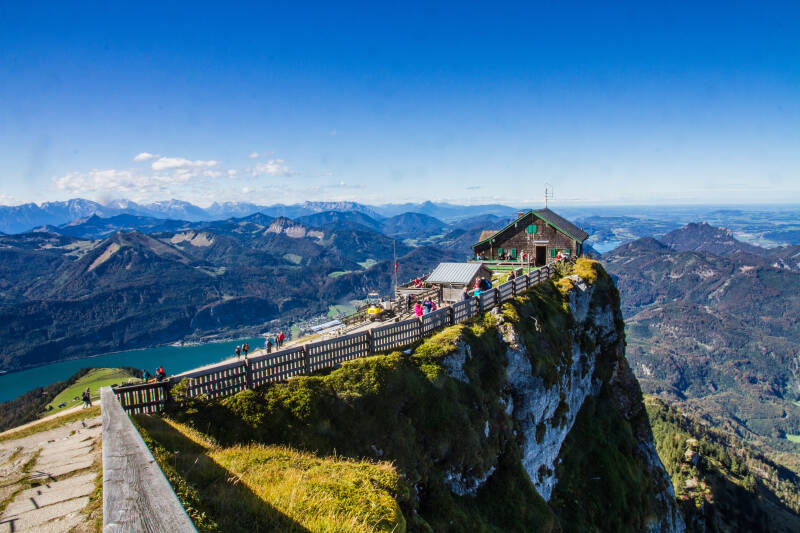 Weer zo’n dag met een gouwen randje... alle bewolking is overnacht weggewaaid en alhoewel fris ‘s ochtends vroeg ziet het weer er veelbelovend uit. ‘T is zondag dus ontbijten we uiteraard met een eitje😀. Daarna lopend op weg naar het station van de Schafbergbahn dat hier op 10 minuten van de camping in het dorp ligt. Benieuwd of we meekunnen... We boffen want we kunnen met de eerstvolgende trein mee omhoog naar de Schafberg. Dit lijntje is Oostenrijk’s steilste tandradbaantje dat een maximale steiging van 26% heeft. De lijn werd in 1893 al aangelegd. Er wordt ook nog met stoomloc’s gereden maar onze trein wordt aangestuurd door een diesel-elektrische loc. De pret van het ritje van 40 minuten naar de top op 1732 meter hoogte is er niet minder om. Voor Abby jammer, want ze moet haar muilkorf om. Gedeelde smart want wij onze mondkapjes. Ondanks de aanwijzing beneden dat de treinen met slechts 70% bezetting rijden lijkt onze coupe compleet volgestouwd. Van het eindstation is het een klein stukje omhoog naar de bergtop waar het oudste berghotel-restaurant van Oostenrijk staat, gebouwd in 1862, dus nog ver voor de aanleg van de tandradbaan. Ze serveren er een prima capucino en we nemen er meteen maar een topfenstrudel met vanille saus bij. Lunch is binnen😉. We lopen wat rond op de top en maken (teveel) foto’s. Met respekt bekijken we de dappere dodo’s die hier met een parachute de berg afrennen om vervolgens naar beneden te zweven. De uitzichten rondom zijn panoramisch, en wat dat betreft hebben we het weer mee. De rit naar beneden duurt uiteraard net zo lang maar nu hadden we de mazzel dat we met een ingelaste rit meekonden en hadden we twee banken privé. In het dorp slaan we in plaats van rechtsaf richting camping eerst linksaf de boulevard op en het centrum van St. Wolfgang in. Eline scoort er nog wat leuks en we zien inderdaad hotel Im Weissen Rossl dat overigens zo rood is als een biet. Er staat een grote en indrukwekkend mooie kerk waarvan we het interieur om de beurt bewonderen. Terug bij ons tweede huis is het nog steeds heerlijk weer en kunnen we nog lang buiten genieten. Op de camping is het een komen en gaan van nieuwe en oude gasten. De redelijk chagrijnige gastvrouw en -heer hebben het er maar druk mee. Het is allemaal wat typisch (over)geregeld hier. Dat begon bij aankomst al met een dubbel A4 vol met regels die je aan de receptie moet lezen en bevestigen dat je er aan zult voldoen... Je betaalt al een redelijke hoofdprijs en moet dan nog muntjes kopen om te douchen. Dat doen we dus in de camper. Op het toilet staat aangegeven dat je toiletbezoek zoveel mogelijk in je eigen camper of caravan moet doen. Water vullen en dumpen is achter slot en grendel en als je korter dan drie nachten staat kosten beide euro 2,50. Af en toe vullen we wat water met de gieter bij. De wifi code moet ik nog steeds krijgen maar ik verwacht dat deze niet gratis is dus gebruiken we ons eigen 4G tegoed. Al met al een beetje “engig” - morgen gaan we maar eens verkassen😉. Jammer want de plek zelf is prachtig en de ligging vlakbij het dorpje ook.