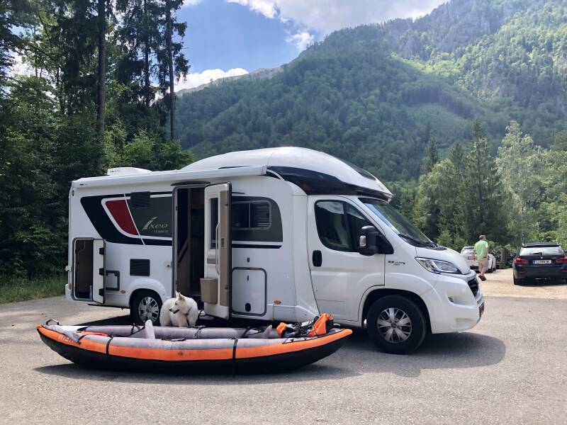 Nu een plekje voor de nacht zien te vinden. Er is een camping aan de Grundlsee, die weliswaar wisselende reviews krijgt, maar wel aan het meer ligt. Een uurtje rijden van hier. De route is ook weer mooi, de Grundlsee ook, maar de camping is dat bepaald niet. Wat een akelig veld, schots en scheef, volgepakt met campers en caravans. Geen ruimte tussen de plekken. Niks voor ons. We draaien een ronde over het terrein en met gezwinde spoed naar de uitgang. We bekijken nog even de park4night app en begeven ons via Bad Ischl naar de Traunsee in het Salzkammergut. In de plaats Ebensee ligt een prima camperplaats, niet goedkoop maar van alle aansluitingen voorzien, en op steenworp afstand van het meer. Als je de steen de andere kant op gooit, ben je in het centrum van Ebensee en daar spotten we een mooie Gasthof voor een lekkere Schnitzel, en als voorafje een mooi gevonden alternatief; een Vitello Forello. We laten het ons prima smaken samen, en worden nog getrakteerd op een muzikaal intermezzo door de Kapelle Ebensee, die hier een rondje muziek komt maken. Ze hadden welgeteld 100 meter gemarcheerd, en twee nummertjes gespeeld, toen ze hier op het terras van bier en Almdudler werden voorzien. Na een pauze die onze hele maaltijd duurde, pakte men de instrumenten weer op en begon aan de afmars. Abby had het zwaar, want net zoals geen fan van onweer, is ze ook geen fan van het slagwerk, en zit weer te trillen als een espenblad. Een stukje schnitzel verzacht de pijn. Mooi detail in het muziekkorps; de grote trom staat op een karretje, dat wordt getrokken door een verder niet musicerend lid. De grote trommelaar die erachter loopt heeft een gehoorapparaat, dat verklaart het volume van z’n slagen! Maar absoluut mooi dat dit hier nog zo beleefd wordt..