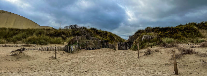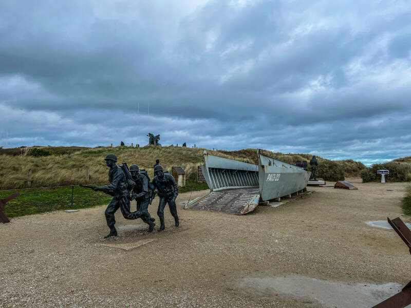Dat is het plaatsje waar de Amerikaanse paratroeper John Steele op 6 juni 1944 een onfortuinlijke landing maakte en met zijn parachute bleef hangen aan de kerktoren. Hij heeft geluk gehad want veel van zijn maten waren een makkelijk doelwit tijdens deze foutieve dropping recht boven het dorp. Uiteindelijk werd Steele gevangengenomen maar wist later te ontsnappen en zich weer bij zijn divisie aan te sluiten. Onze volgende stop is Utah Beach, waar vanaf 6 juni 1944 Amerikaanse troepen tijdens de invasie aan land kwamen. De landing hier was succesvol, gezien de Duitsers deze hier niet voorzien hadden. Aan het eind van de dag wisten de Amerikanen 20.000 manschappen en 1.700 voertuigen aan land te krijgen. Er is hier een memorial en er ligt een landingsvaartuig, verder staat er een Sherman tank en er is een museum. Uiteraard kun je het strand op, en op het strand herinnert niets direkt meer aan de landingen. Indrukwekkend blijft het, al deze stranden en de gebieden eromheen. Alles ademt eigenlijk WOII... We maken er een mooie strandwandeling en overleggen hierna wat te doen.