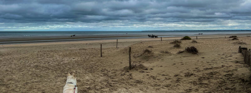 Geslapen als blokken! De regent tikt op ‘t dak vanochtend, ik draai me nog eens om, en Abby ook denk ik, want ik hoor haar niet. Na een half uur is het droog geworden en togen we naar het strand voor de gebruikelijke ochtendwandeling. Er staat een beste wind en we hebben het hele strand voor onszelf. Vanochtend willen we richting de noordwest kaap van Normandië, echter het weer wordt gaandeweg slechter. Veel regen en bar weinig zicht. We besluiten de kaap te laten voor wat ‘ie is en zetten koers naar Cherbourg. We zoeken een Super-U of grote LeClerc voor wat extra boodschappen. We vinden er een Auchan, die winkel waren we nog niet eerder tegengekomen. We slagen er voor alles en plotten daarna Saint Mere Eglise in de route-app.