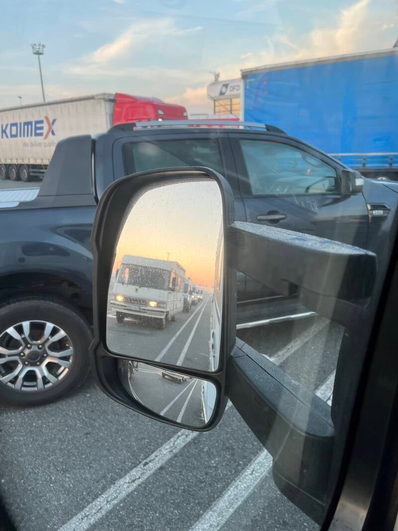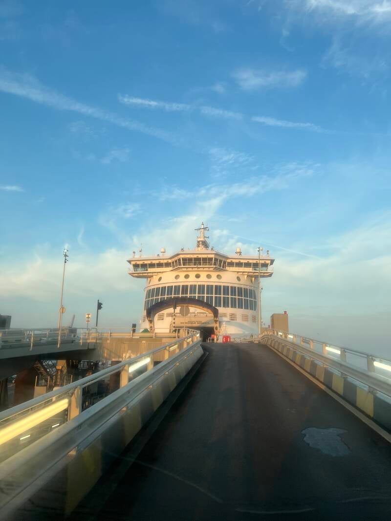 De nacht is wat doorwaakt, want met de dakvensters open om wat koelte binnen te brengen, bereiken ons ook de geluiden uit de haven, en die gaan hier 24/7 door. Na een korte uitlaatronde in alle vroegte begeven we ons met de camper naar de vlakbij gelegen check-in. De eerste controle-post behoort aan DFDS, de rederij waar we mee varen. Paspoort/ID controle en het dieren-paspoort wordt nauwgezet door de ijverige dame gecontroleerd. We denken dat ze nog niet zo lang in dienst is, want het document gaat regelmatig naar haar buurman in het hokje voor een verdere controle. Maar alles klopt, en we mogen door. Tweede stop is de Franse paspoortcontrole, hierna volgt de Franse douane, waarbij even binnen in de camper, en in de garage gekeken wordt. Vierde stop, Britse paspoortcontrole. Je zou denken, nou zijn we er toch wel doorheen, maar nee hoor, er vindt nog een Britse douanecontrole plaats. Dit was werkelijk de allerijverigste ambtenaar, eerst de garage aan twee kanten open, dan de gas-kast en het serviceluik. Natuurlijk wil ‘ie ook naar binnen en vraagt of de hond kwaad in de zin heeft. Meestal niet, was mijn antwoord en ietwat beducht gaat het menneke naar binnen. Een blik in de badkamer en dan moet ‘ie onder alle banken kijken, dus de kussens eraf en weer terug. Hij begrijpt niet waar ons bed is, en we leggen hem het hefbed uit. Dat moet natuurlijk ook even zakken, want je weet nooit wie daartussen verstopt ligt. Enfin, we zijn er door, en begeven ons in de ons toegewezen rij. Omdat wachten in zo’n rijtje altijd te lang duurt, doen we hier op het gemak ons ontbijt en al snel daarna kunnen we na alle vrachtwagens aan boord.