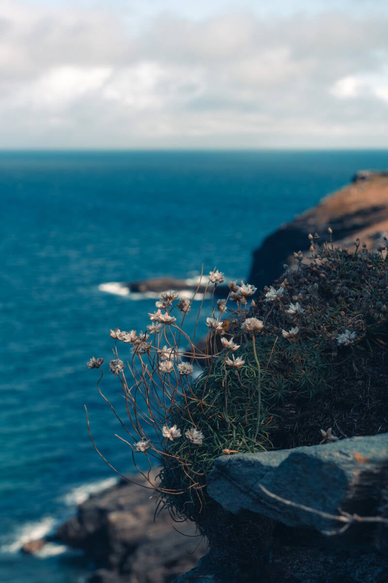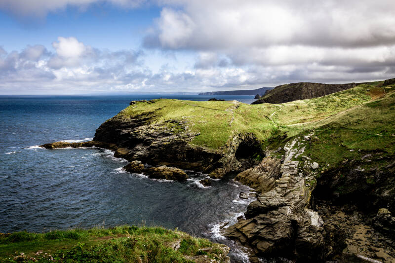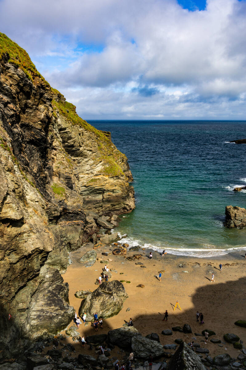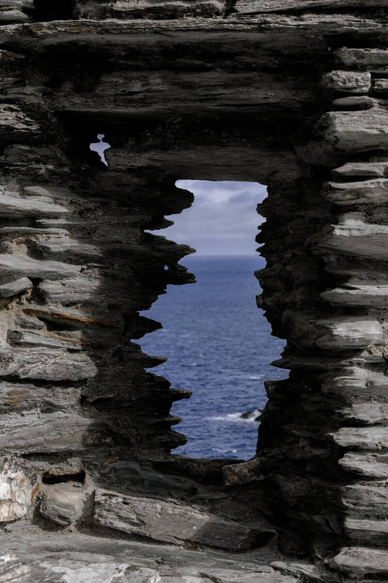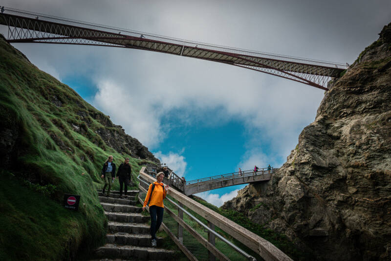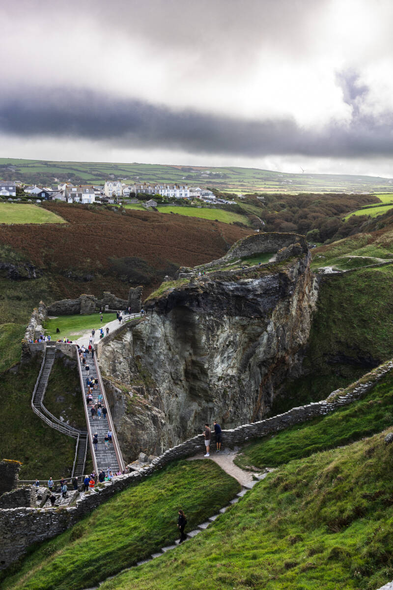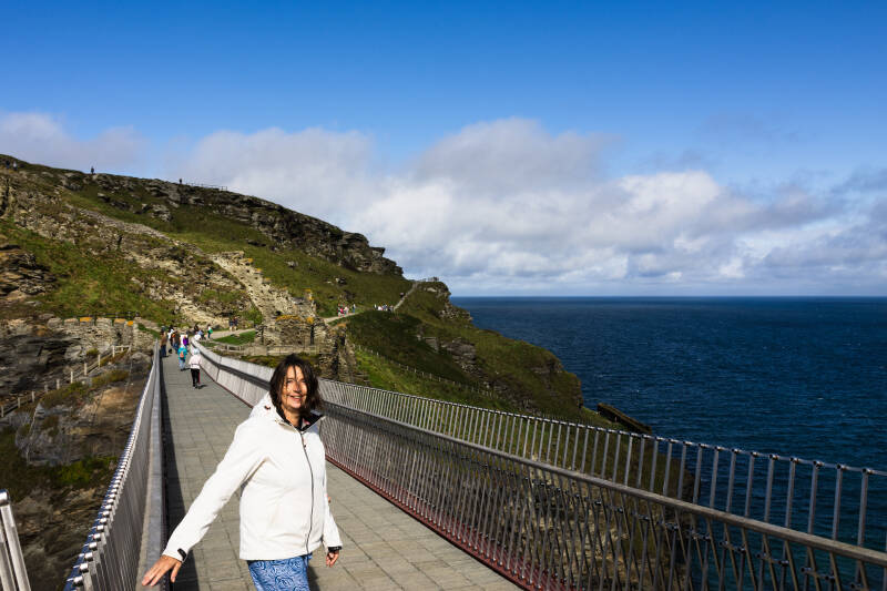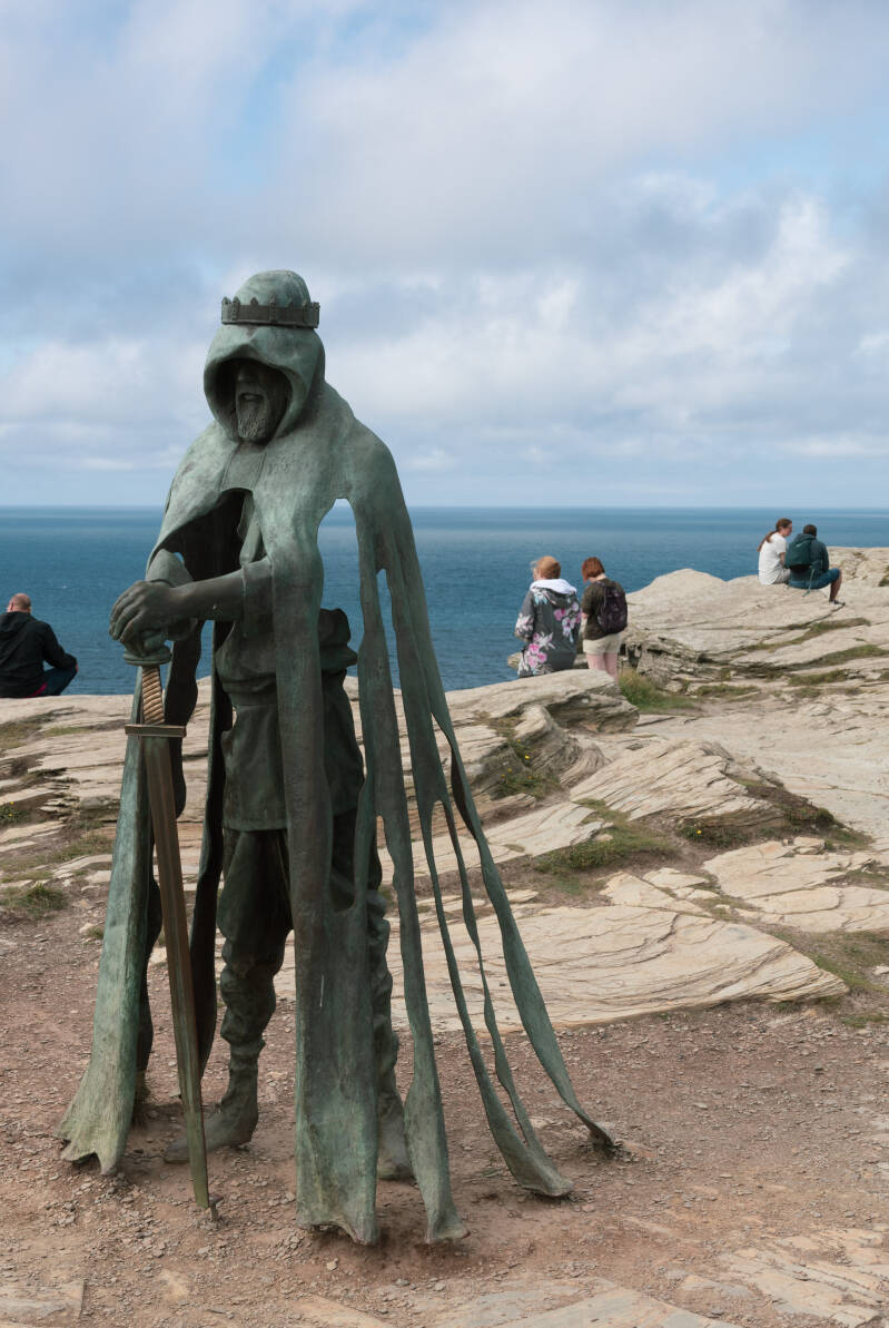 De dag begint met wat miezer, een erg lange ochtendwandeling met Abby zit er niet in vandaag. We willen naar de Atlantische kust, en onze eerste stop wordt Tintagel, de ruïne van een 13e eeuws kasteel, waar de legendarische King Arthur met zijn Guinevere en de tovenaar Merlijn zouden hebben gewoond. Er is maar weinig bekend over deze Arthur, en veel ervan is ontsproten aan het brein van ene Geoffrey of Monmouth, die in de vroege Middeleeuwen “a History of the Kings of Britain” schreef, en waarin Arthur op magische wijze wordt bedacht binnen de muren van dit bewuste kasteel. Echt gedocumenteerd is deze periode uit de Britse historie niet, en er is dus veel bij verzonnen in de loop van de eeuwen. Tintagel het dorp profiteert er goed van, uitgestrekte parkeerterreinen en toeristenwinkels te kust en te keur. Het is van een gezellige bedrijvigheid. Abby mag overal mee naar binnen, daar doen de Engelsen absoluut niet moeilijk over. We dalen af naar de ingang van de ruïne onder aan de kliffen. Een doedelzakspeler verwelkomt ons, dat is erg leuk, maar moet je nooit té lang horen vind ik. Op de plek waar vroeger twee kliffen met elkaar verbonden waren, is nu een pracht van een hangbrug geplaatst, met stukjes leisteen als bodembedekking. Je moet er maar op komen. Het is hier trouwens behoorlijk druk, zomaar op een doordeweekse dag in september. We storten ons in de massa en verwonderen ons over de uitzichten, en over hoe men hier op deze lokatie zo’n immens kasteel, want dat moet het geweest zijn, heeft weten te bouwen. Er zijn ook fundamenten van een nederzetting uit de Dark Ages, het eind van de 4e eeuw, toen de Romeinen de aftocht hadden geblazen en er onrust was door migratie, conflicten en invasies. Arthur is als opengewerkt standbeeld weergegeven op één van de kliffen. Hier was het een drukte van belang met mensen die naast Arthur vereeuwigd wilden worden op de gevoelige plaat. Het plaatje hieronder is dus met een hoop mazzel gemaakt.