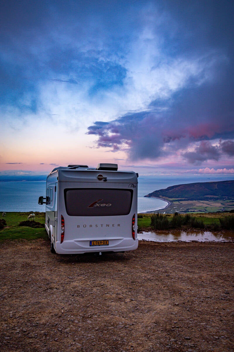 Op naar een plekje voor de avond en nacht. We dalen via een feeëriek weggetje af naar Lynton en stijgen vervolgens met een percentage waarvan ik niet had gedacht dat dit met een camperbus kon, 25%, naar de hoge kust van het Exmoor National Park. Weer zo’n mooi heidegebied met loslopende grazers. Via de Park4Night app hebben we een parkeerplaats op het oog met uitzicht op de kust. Die vinden we, en na een beetje puzzelen hoe we de bus een klein beetje waterpas krijgen, staan we met het mooiste uitzicht ever.. niks meer aan doen. Heerlijk genieten van het Bristol Channel dat we onder ons zien liggen, en aan de overkant de kust van Wales. Een beetje scheepjes zoeken, schaapjes tellen en de avond valt. Er ontstaat hier pal aan de kust zee-nevel. Mooi om te zien hoe zich dat continue vanuit het zeewater ontwikkelt. Zodra het echt donker wordt zien we de lichtjes in Wales ook niet meer, de nevel heeft zich blijkbaar uitgebreid. We hebben de plaats hier voor onszelf, en voor de schapen. Morgen verder!