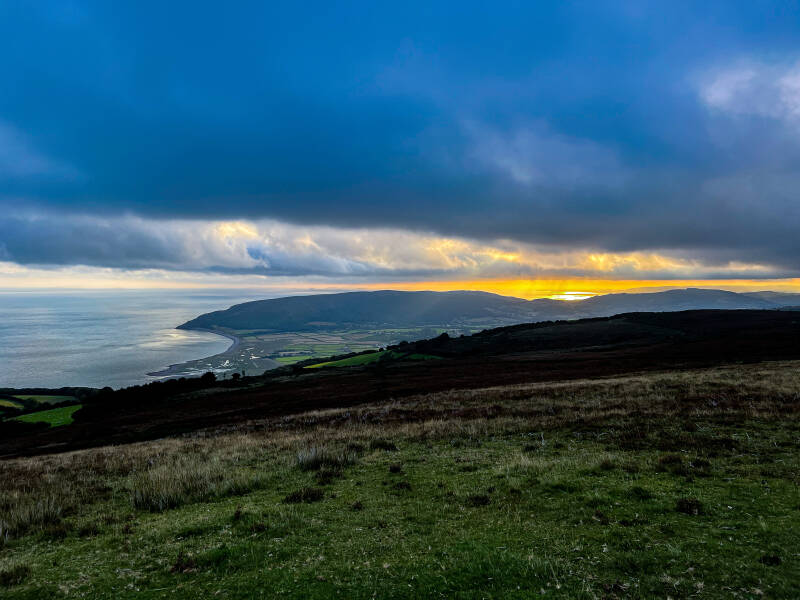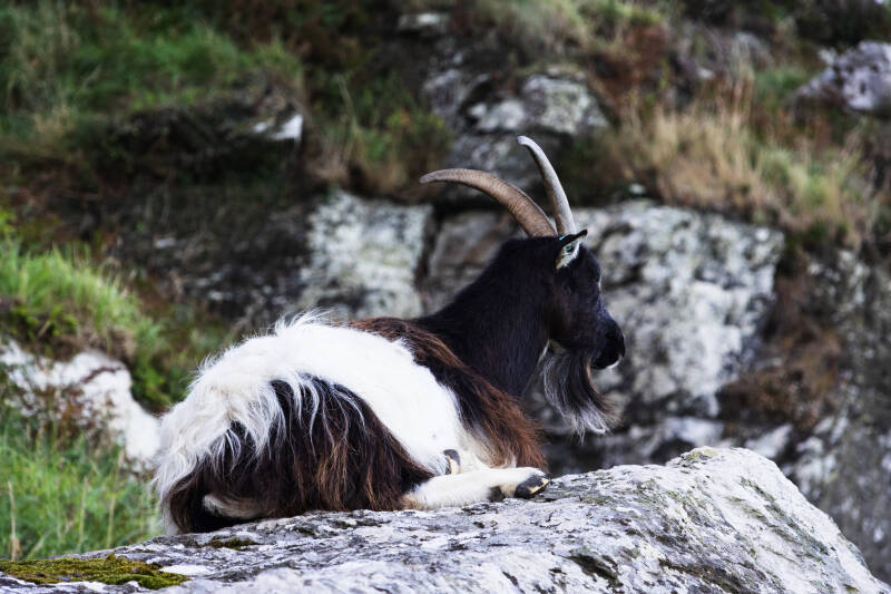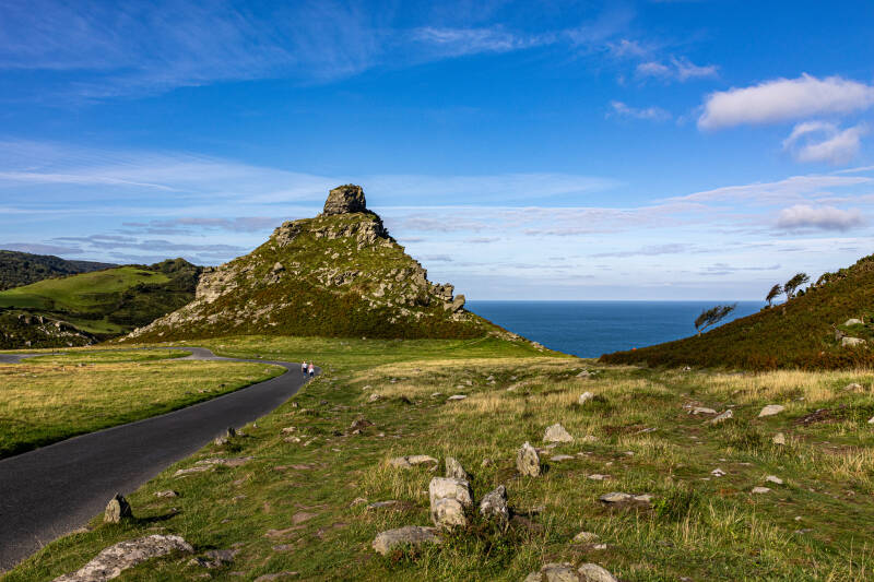 We zijn alleen gebleven vannacht. Behalve schapen geen sterveling meer gezien tot aan het ontbijt, toen de inzittenden van een Zwitsers wagentje kort van het uitzicht kwamen genieten. We rijden de mooie kustroute terug naar Lynton, en via een wederom zeer steile weg nog een stukje verder omhoog, waar we een wandeling langs de Valley of Rocks willen doen. Dit gebied maakt deel uit van het Exmoor National Park. We kunnen de camper kwijt op een parkeerplek waar we toch ook eens munten kunnen gebruiken om het parkeergeld te voldoen. Het keurig aangelegde wandelpad loopt langs de rotskust terug naar Lynton, dat hoog tegen de rotsen is aangebouwd. Je kunt er met de Cliff Railway afdalen naar Lynmouth, dat beneden aan de kust ligt. Wij lopen deels hetzelfde mooie pad weer terug tot halverwege, waar je een doorsteek naar de eigenlijke Valley of Rocks maakt. Behalve veel wandelaars komen we ook regelmatig geiten tegen. Abby zou ze het liefst de afgrond in willen jagen, maar dat weten we gelukkig te voorkomen. We hebben er heerlijk weer bij, de meegenomen jassen gaan ergens onderweg uit. Al met al één van de mooiste kustwandelpaden die we ooit hebben gezien.