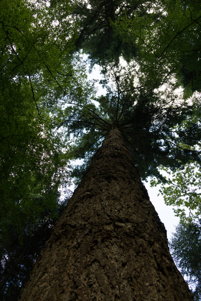 Bij Blackwater is een Tall Trees Trail uitgezet, een rondje van 1,5 mijl langs de reuzen-bomen die hier ooit zijn aangeplant; Douglas Fir, Redwood en Sequoia. We kennen de Tall Trees nog uit Californië, en zien dezelfde soorten hier ook terug. Er staan indrukwekkende exemplaren tussen en we hebben er een mooie wandeling aan. Halverwege is een parking waar een ijscoman staat. Lekker, een ijsje, ware het niet dat de portemonnee en de pasjeshouder van ondergetekende nog in de fietstas zitten. De rest van de wandeling is er toch wat spanning, maar alles blijkt er bij terugkomst gelukkig nog in te zitten. Omdat we al behoorlijk wat kilometers door het bos hebben gefietst plus anderhalve mijl gelopen, besluiten we om de korte route terug richting campsite te nemen. Die voert over de ‘hoofdweg’ als je die zo mag noemen. Best smal, en de kanten lopen abrupt en steil af, zodat je altijd (zeker met de fietskar) een beetje richting midden koerst. Met het passeren van vrachtwagens, paarden, pony’s en ezels, koeien plus een dubbeldekker bus, en daarbij opgeteld het aan de linker kant van de weg rijden, wordt het een inspannend ritje. Maar we slaan ons er fier doorheen en bereiken moe maar voldaan na 27 fietskilometers op en af, onze camper.