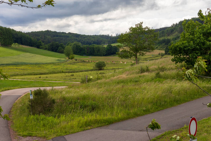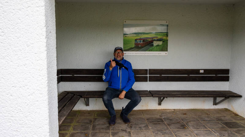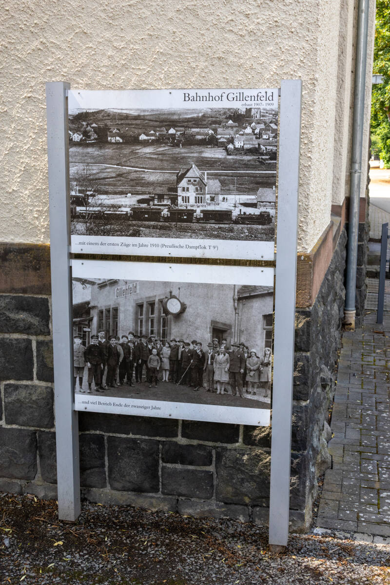 In Gillenfeld, dat halverwege langs de lijn ligt, repeteert de fanfare in het voormalige station. We hebben ontdekt dat de 40,8 km lange spoorlijn in 1909 is aangelegd door de Preussische Staatseisenbahnen. Het traject liep tussen Daun en Wittlich en de personendienst is gestopt in 1981. In 1988 is alles stilgelegd en werden de sporen opgebroken, waarna ze als fietspad zijn ingericht. Om de foto's die her en der te zien zin blijken er zowel personen als goederentreinen te hebben gereden. Onder andere de 'schienenwagen', de Duitse railbus, heeft hier gereden. Delen van onze fietsroute gaan ook over de gewone weg, maar altijd daar waar maar heel weinig verkeer is. En af en toe gaat het goed steil naar beneden, en bereiken we snelheden van 45 km per uur op de fiets. Het blijft ook gelukkig droog ondanks de dreigende luchten en ondanks de voorspelde buien.
