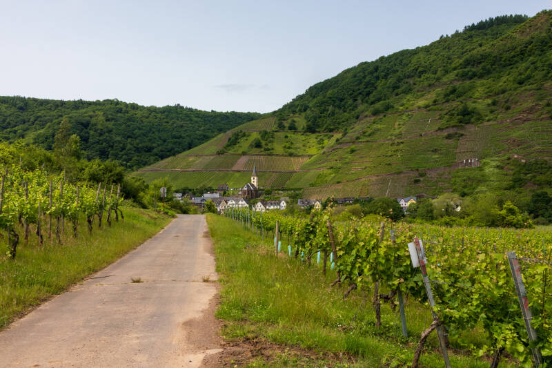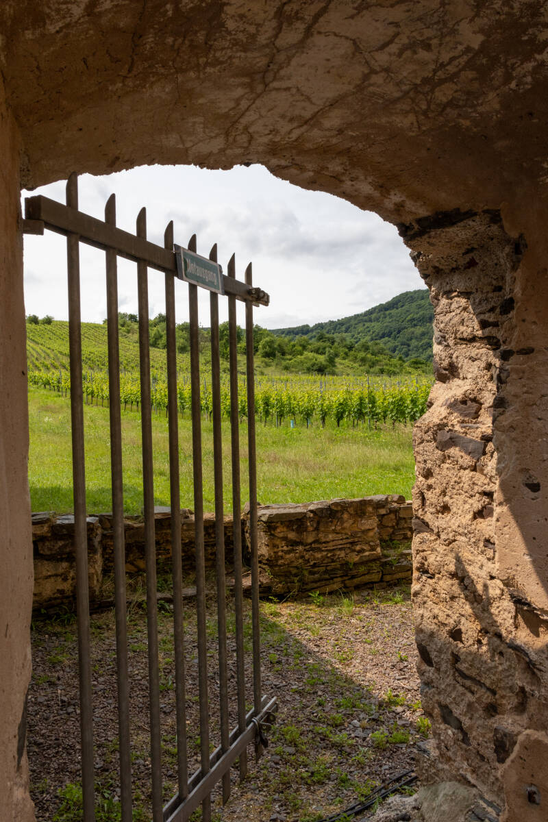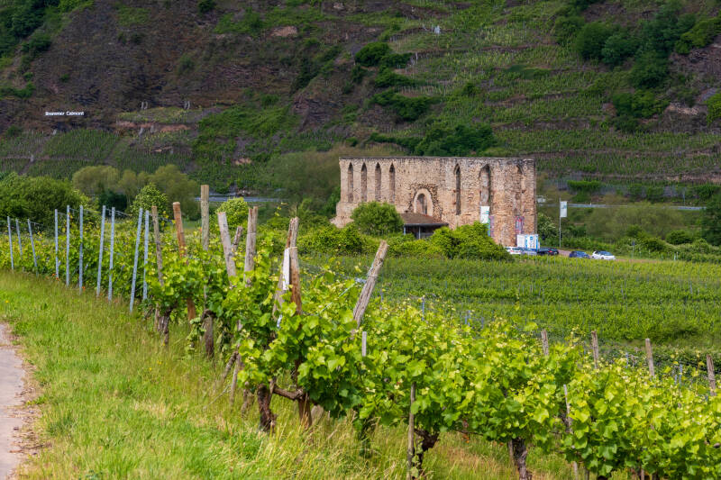 Het heeft vannacht geregend dat het een lieve lust is. Gelukkig staan we op gravel, alles is zeiknat maar we komen goed weg. Het zou vandaag langzaam wat vriendelijker qua weer moeten worden. Heel af en toe zien we inderdaad een stukje blauw aan de lucht. Zo dicht bij de Moezel, daar kunnen we niet omheen. We besluiten een stuk langs de rivier te toeren, eigenlijk zonder vast plan. We hebben ooit eens op een camperplaats bij Pünderich gestaan, dus dat wordt voorlopig het doel. Net na de sluizen bij St. Aldegund komen we langs een leuke camperplaats waar nog voldoende plek is, pal aan de rivier, en verhard. Het is nog voor elf uur in de ochtend maar je kunt hier prima fietsen, dus besluiten we hier te blijven. We pakken de fietsen en peddelen langs het mooie fietspad langs de Moezel terug naar de brug bij Neef en steken daar over. Een stuk verder aan de andere kant ligt langs de wijnvelden de ruïne van klooster Stuben en daar willen we wel eens langs. We hebben de ruïne vaak gezien vanuit de auto of camper aan de overkant maar zijn er nog nooit dichtbij geweest. Fietsen is hier erg leuk. De fietspaden zijn prima en je fietst langs de meest onmogelijk steile wijnvelden.