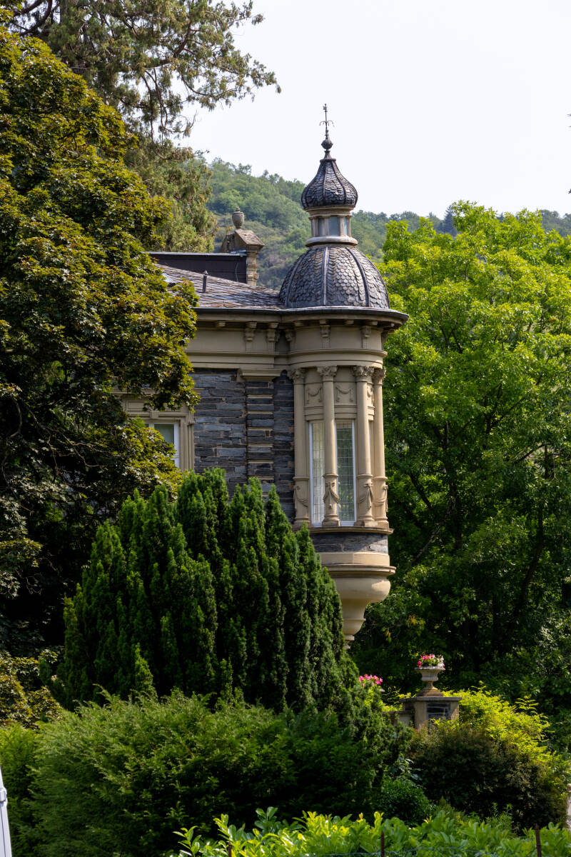 Er zijn twee mogelijkheden, een korte zware en een lange iets makkelijkere. Gezien het kasteel onder ons ligt, kiezen we voor de “zware” bergaf. En zwaar is ie, het pad is wat smal en vol met keien en de terugkerende mensen puffen en hijgen dat het een lieve lust is. Na bijna 2 kilometer ontwaren we de contouren van het kasteel. Het ziet er schilderachtig uit, gelegen op een rotswand temidden van het smalle dal van de Eltz, een zijriviertje van de Moezel. Voor 14 euro op krijg je toegang, het kasteel door met een engelstalige gids, en zelfvoorzienend door de ‘schatkamer’. De architectuur is bijzonder. Er zijn heel veel torentjes en verborgen hoekjes en het stucwerk is om elke bocht weer anders. De grondvesten zijn hier meer dan 850 jaar geleden gelegd en sindsdien is het kasteel privébezit van de familie Eltz geweest. Nu nog, alleen de eigenaar woont er niet in. Alleen gedurende de zomermaanden heb je er toegang.