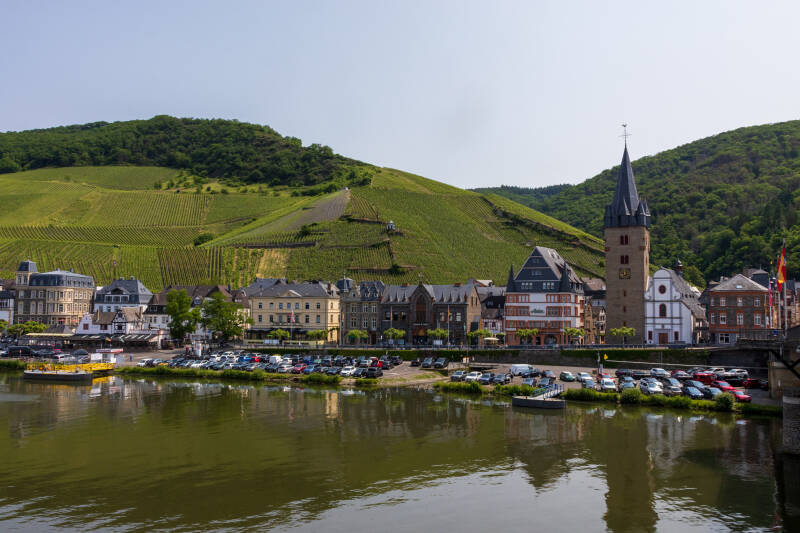 De middag benutten we wederom om per fiets een stukje omgeving te verkennen. We fietsen nu de andere kant uit langs de Moezel en passeren de dubbeldeksbrug bij Bullay die in 1877 werd gerealiseerd. Bovenop bevindt zich het spoor, en onder op de brug rijden auto's, fietsers en is een voetpad. In februari 1945 werd de brug nadat de spoorlijn vanaf 1944 een doelwit werd, gebombardeerd en vernield. Pas in april 1947 was de brug hersteld voor verkeer. Wij fietsen nog een stukje langs de rivier. Met behulp van de app Komoot heb ik een leuke route gevonden die na een paar honderd meter bergop gaat in de richting van de bergrug tussen de rivier in (een zogenaamde Moselschleife). Vanwege het meanderend karakter van de rivier zijn er een aantal punten vanwaar je bergaf links zowel als rechts de rivier kunt zien. Aan het eind van de route is een uitzichttoren. Het is druk langs de route. Overal wandelaars en we ontdekken dat ook hier (we hadden er vanochtend onderweg al meer gezien) wijnfeesten zijn. Op enig moment worden we door borden gesommeerd af te stappen, precies bij een stukje waar onze route een stukje naar beneden gaat. Het weggetje ernaast en omhoog leidt naar een kapel bovenop de berg, en ziet zwart van het volk, en tentjes waar wijn wordt geschonken. Ook zwart wordt de lucht, en als de sluizen open gaan, is er geen houden aan. Gelukkig kunnen we onder een boom wat schuilen, het duurt maar kort en we vervolgen onze route. Helaas ook hier overal wandelaars, zoveel zelfs dat we grote delen alleen kunnen lopen, bergop met de fiets aan de hand. Bijna iedereen loopt hier met al dan niet volle wijnglazen en het lijkt een dolle boel. Maar om doorheen te fietsen is het niks dus besluiten we, bovenop de berg aangekomen, een kortere route terug het dal in te nemen. Het is ook prima zo, een beetje relaxen in en bij de camper hoort er ook bij.