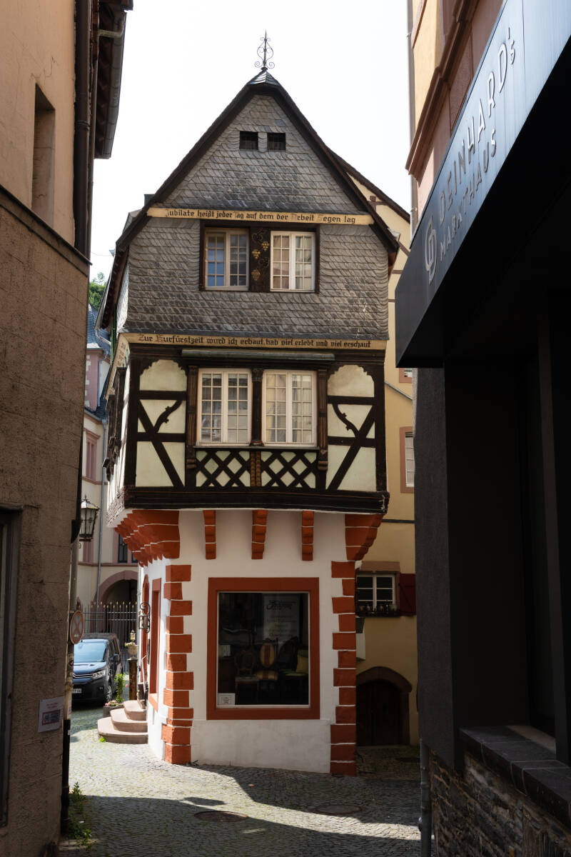 Ook aan een lang pinksterweekend komt een eind, maar deze laatste dag willen we zo lang mogelijk rekken. We toeren na ontbijt en camper-servicen een eind langs de Moezel en stoppen in Bernkastel Kues, een alleraardigste (toeristische) plaats in twee delen. Aan de ene kant van de rivier ligt Kues, en aan de andere Bernkastel. De op Park4Night gevonden parkeerplaats voor campers aan de rand van het stadje is helaas een bouwplaats en we denken het bezoek te moeten overslaan, maar een stukje verder is een parkeerplaats waar al heel veel campers staan en daar vinden we zowaar nog een plek om te parkeren. De koelkast op gas, dakluik open voor de frisse lucht voor kater Charlie en we nemen de benenwagen. Prachtige gebouwen staan langs de toegangsweg naar het centrum, de meeste "Weingut", het is hier natuurlijk wijn wat de klok slaat. We steken de rivier over en aan de overkant vinden we het kleine maar pittoreske oude centrum van Bernkastel. Een prachtige markt met van die echt Duitse vakwerkhuizen, talloze terrasjes en uiteraard winkels. Het is er levendig genoeg en we slenteren een tijdje langs wat er zoal te zien valt, en strijken dan neer op een terras in de zon voor een Flammkuchen-lunch. Een bijzonder lekker exemplaar, genoeg om de rest van de dag op te teren. We slagen nog voor wat schoeisel (de Riekers zijn hier een stuk goedkoper) en lopen dan terug naar de bus. Helaas zijn we verwend met een parkeerbon van tien euro, omdat we (en alle andere camperaars ook) geparkeerd staan op een parking voor personenauto's. Er stond inderdaad een teken van een personenauto onder de "P" en dan mag een camper daar officieel niet staan. Betalen kan via de qr-code maar helaas werkt dat niet. Maar eens kijken of we thuis nog een papieren bekeuring krijgen en anders hebben ze pech. Via Piesport en de Panoramastrasse rijden we hoog langs de Moezel ten afscheid en dan wordt de route huiswaarts wat saai via de snelweg naar Verviers, Luik en Antwerpen. Thuis de bus leeg en gekuist, klaar voor de stalling. We kijken terug op een perfect lang weekend!