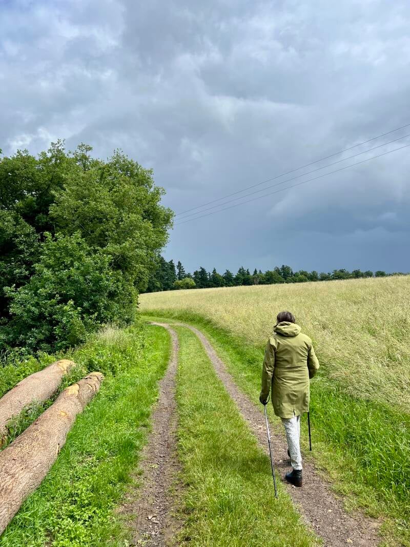 Terug in de camper relaxen we nog wat en tegen de avond lopen we naar het dorpje Schalkenmehren naar café Mehresblick voor een lekkere schnitzel. De calorieën lopen we erna er weer af op het voetpad naar de camperplaats. Daar is een automaat met allerlei etenswaren, en ook met ijs. Gezien we het toetje hadden overgeslagen, trekken we allebei een ijs naar keus en doen het dessert in de camper. Het is hier rustig en stil. Zo af en toe rijdt er beneden ons een auto voorbij. We horen de schapen op de tegenoverliggende heuvel en af en toe kwakende kikkers. Met de nachtrust zal het wel goed komen. Oh ja, en het is nog steeds droog, zelfs een beetje warm.